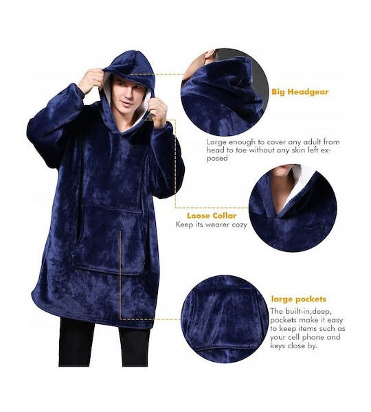 Huggle Κουβέρτα Μπλε Καρώ Βελουτέ με Μανίκια και Κουκούλα 70x90cm