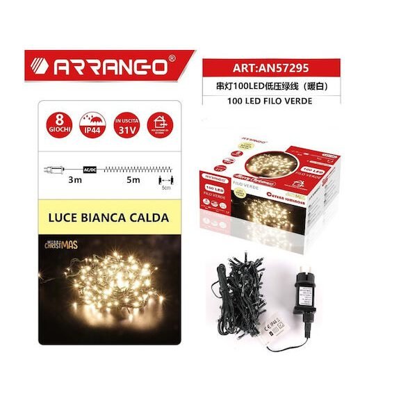 100 Λαμπάκια LED Θερμό Λευκό σε Σειρά με Πράσινο Καλώδιο και Προγράμματα AN57295