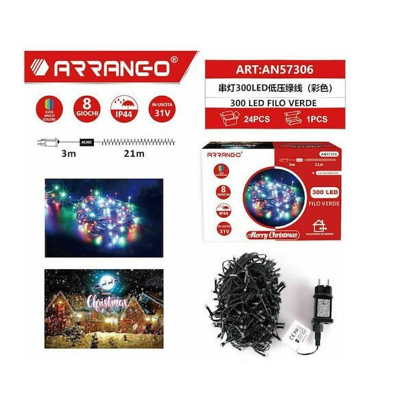 300 Χριστουγεννιάτικα Λαμπάκια LED Πολύχρωμα 21μ σε Σειρά με Πράσινο Καλώδιο και Προγράμματα Arrango AN57306
