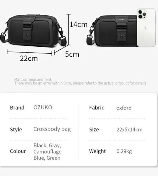 Ozuko 9829 Αδιάβροχο Τσαντάκι Χειρός/Χιαστί 22x5x14cm σε Μαύρο Χρώμα