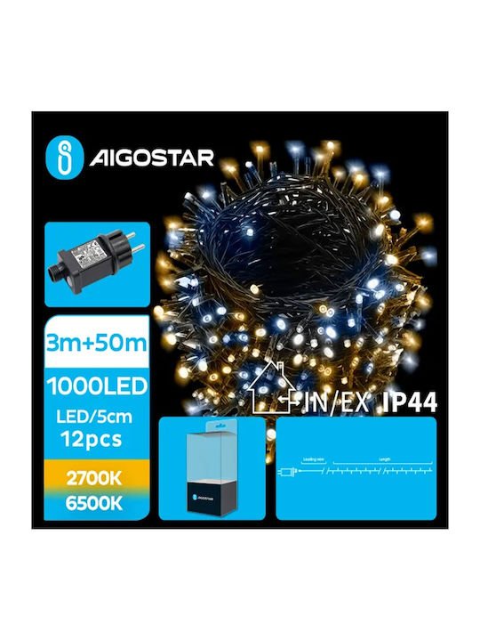1000 Χριστουγεννιάτικα Λαμπάκια LED 53μ 6W 220V IP44 σε Σειρά με 8 Λειτουργίες και Χρονοδιακόπτη σε Θερμό και Ψυχρό Λευκό Φωτισμό Aigostar- 299811