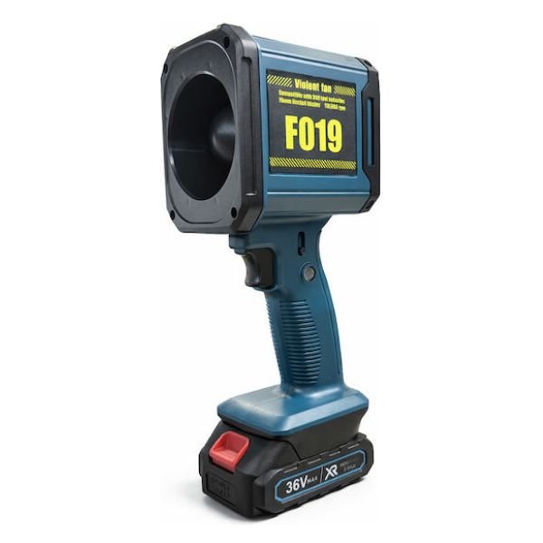 Ασύρματος φυσητήρας χειρός Violent Fan F019 σε μπλε χρώμα, συμβατός με μπαταρίες 18V, με ισχυρή ροή αέρα χάρη στις λεπίδες 70mm. Ιδανικός για καθαρισμό σκόνης, ηλεκτρονικών, στέγνωμα κατοικιδίων και χρήση σε εξωτερικούς χώρους.