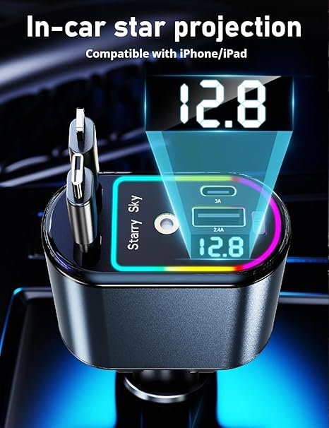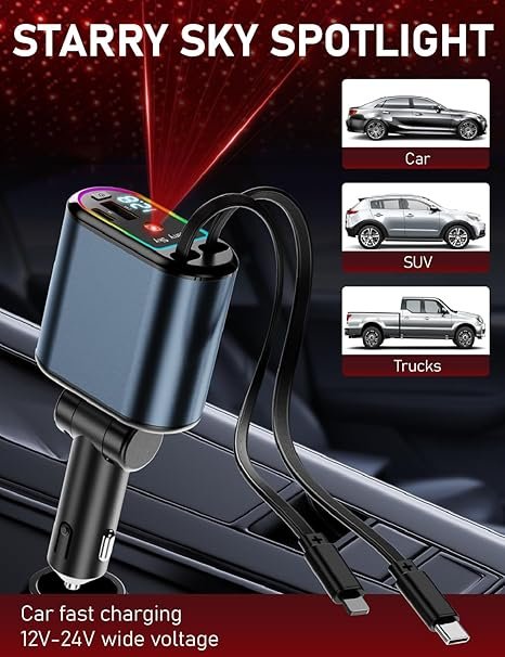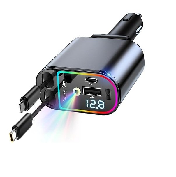 • . ΦΟΡΤΙΣΗ ΠΟΛΛΑΠΛΩΝ ΣΥΣΚΕΥΩΝ: Ο ανασυρόμενος φορτιστής αυτοκινήτου Starlight LWW 4 σε 1 με 2 θύρες USB (USB A+C) και 2 ανασυρόμενα καλώδια (USB C+L) σας επιτρέπει να φορτίζετε πολλές συσκευές ταυτόχρονα. Αποτελεί ένα εξαιρετικό αξεσουάρ αυτοκινήτου, ιδανικό για smartphones και ένα κομψό δώρο για οδηγούς. Αυτός ο φορτιστής εξασφαλίζει γρήγορη και αποτελεσματική φόρτιση, ενώ παράλληλα βοηθά να διατηρείτε το αυτοκίνητο ή το φορτηγό σας τακτοποιημένο και οργανωμένο.