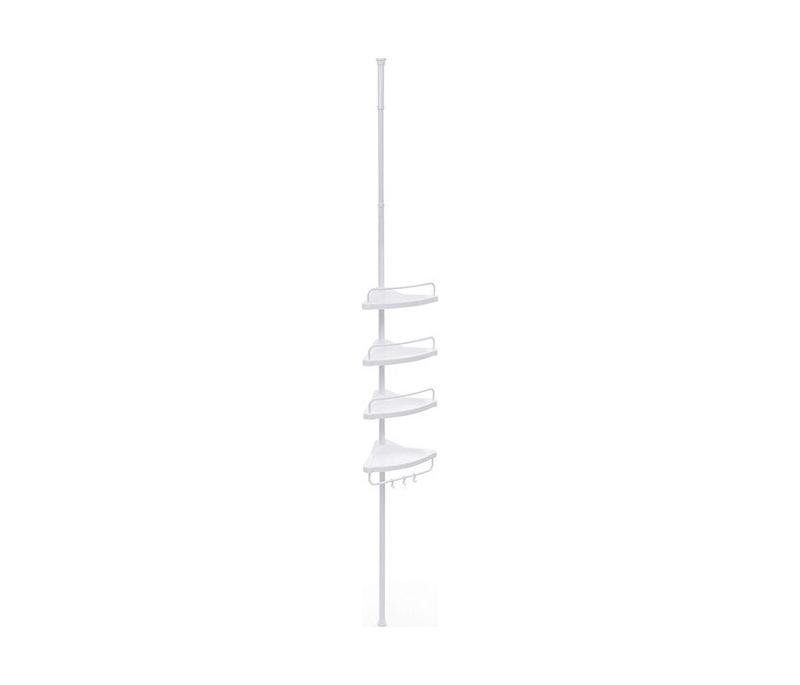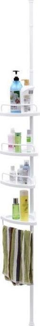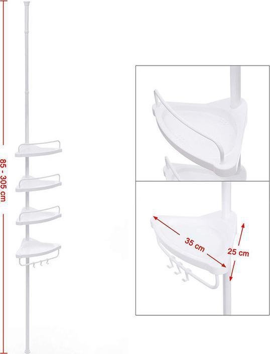 Η εταζέρα μπάνιου, είναι ιδανική για την οργάνωση του μπάνιου σας. Διαθέτει επεκτάσιμη ράβδο από 85 – 305 cm κατασκευασμένη από ανοξείδωτο ατσάλι, 4 πλαστικά ράφια και 3 πλαστικούς γάντζους για να κρεμάτε το σφουγγάρι, μικρές πετσέτες κ.α. Τα ράφια διαθέτουν τρύπες για την εύκολη αποστράγγιση του νερού, ενώ η τοποθέτησή της είναι πολύ εύκολη χάρη στις 2 βεντούζες στερέωσης σε κάθε άκρη.