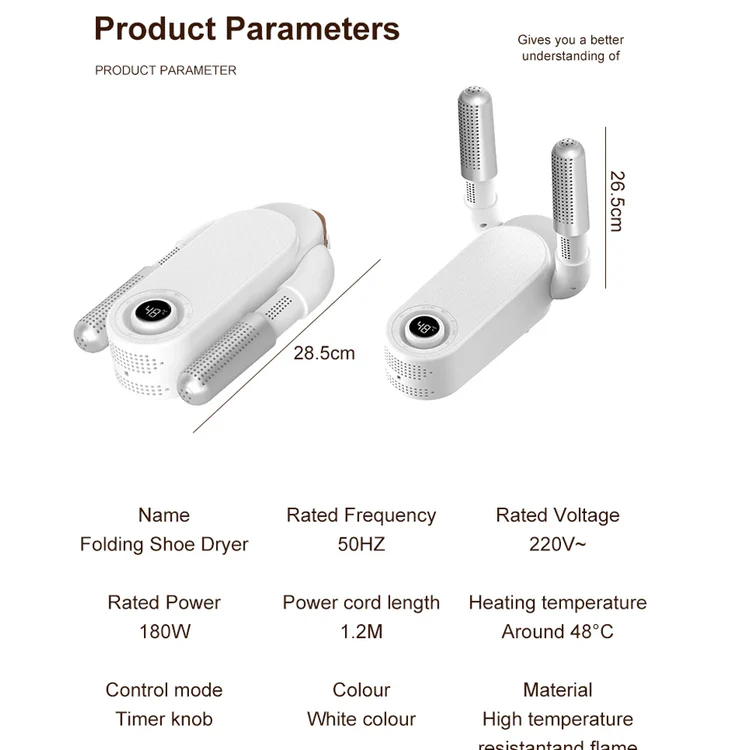 Σχεδιασμένος για ευέλικτη χρήση, αυτός ο στεγνωτήρας παπουτσιών BALASHOV υποστηρίζει επιλογές ισχύος ΕΕ 220V και ΗΠΑ 110V με στοιχείο θέρμανσης 180W, προσφέροντας αποτελεσματική ξήρανση χωρίς υπερβολική θερμότητα. Τα ενσωματωμένα χαρακτηριστικά απολύμανσης και απομάκρυνσης οσμών βοηθούν στην παράταση της ζωής των παπουτσιών σας και τα κρατούν έτοιμα για χρήση σε οποιαδήποτε εποχή. Η ήσυχη λειτουργία και η αξιόπιστη απόδοση το καθιστούν ιδανικό για νυχτερινή ξήρανση ή καθημερινή ανανέωση.
