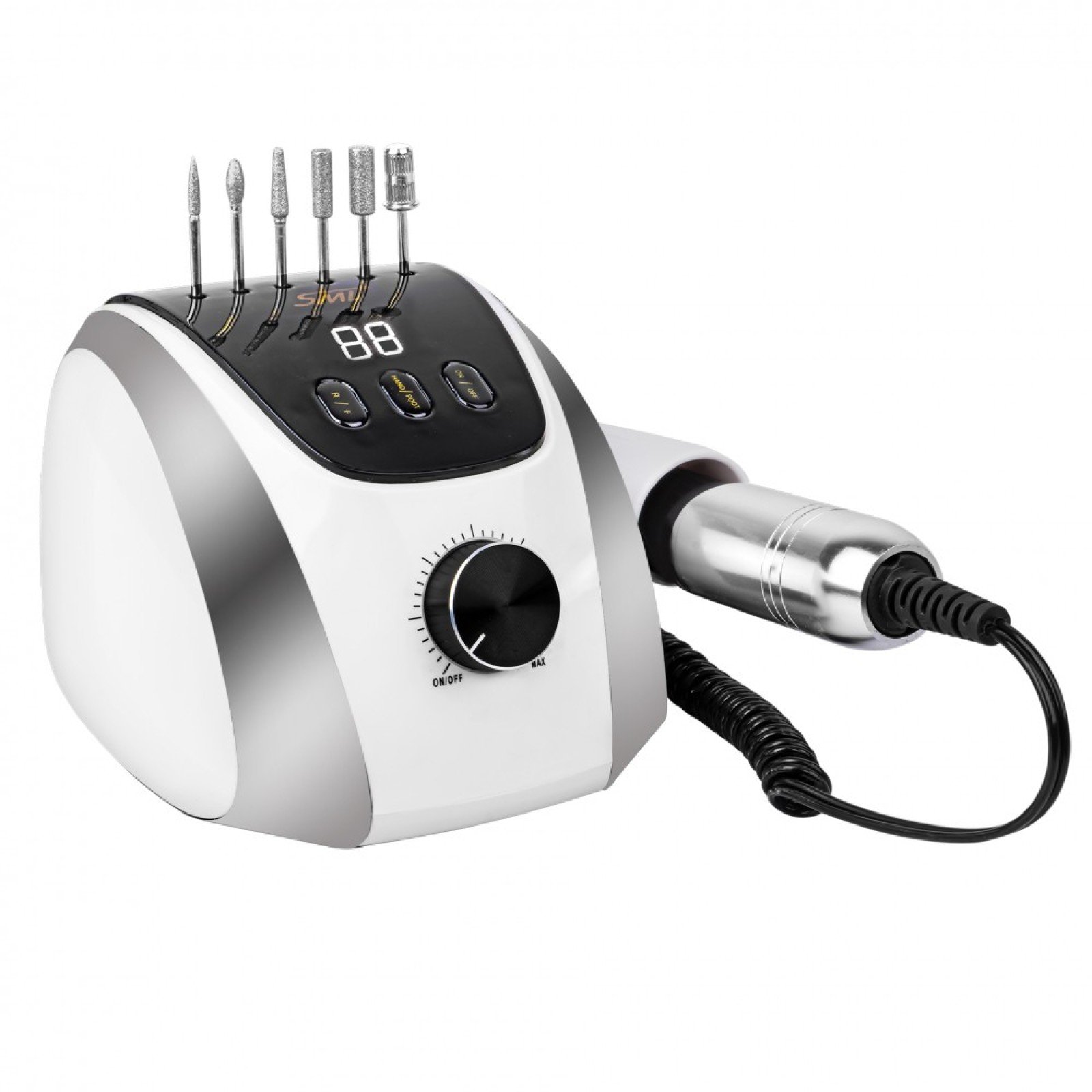 Επαγγελματικός Τροχός Μανικιούρ-Πεντικιούρ SML M13 35.000 στροφών ισχύος 35W Διαθέτει σύγχρονη ψηφιακή οθόνη LED ένδειξης των στροφών και σύστημα κλειδώματος Bit καθώς κι ένα Silicon Shock Absorber Pad για ελάχιστο θόρυβο και δόνηση. Με 3 κουμπιά λειτουργιών: Ενεργοποίηση / Απενεργοποίηση, Προώθηση / Αντίστροφη, Λειτουργία Χεριού (ροδέλα) / Ποδιού (πεντάλ).