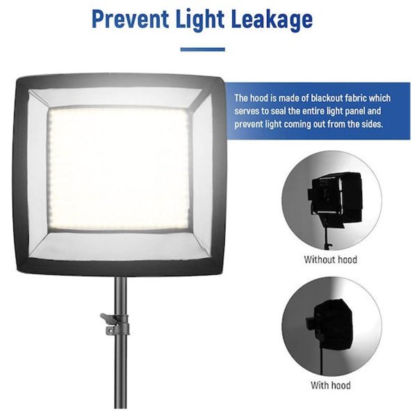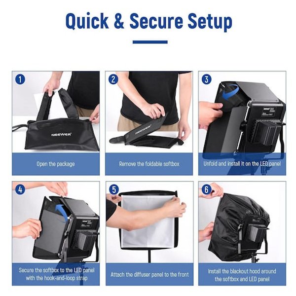 Η εγκατάσταση είναι ιδιαίτερα εύκολη, καθώς η softbox στερεώνεται στο φωτιστικό panel με ανθεκτικές ελαστικές ζώνες και κλεισίματα τύπου hook-and-loop, χωρίς να απαιτούνται εργαλεία. Το blackout ύφασμα αποτρέπει τη διαρροή φωτός από τα πλάγια, διασφαλίζοντας καλύτερο έλεγχο φωτισμού στο στούντιο.