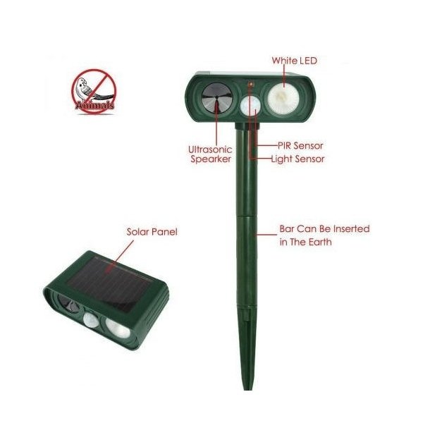 Ηλιακό απωθητικό υπερήχων PX-1009 για εξωτερικούς χώρους, ιδανικό για απομάκρυνση ζώων όπως γάτες, σκύλοι και τρωκτικά χωρίς χρήση χημικών ή δηλητηρίων. Λειτουργεί με εκπομπή υπερήχων μεταβαλλόμενης συχνότητας, η οποία είναι ενοχλητική για τα ζώα, οδηγώντας τα μακριά από τον χώρο κάλυψης.