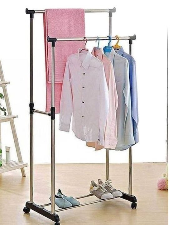 Διπλή κρεμάστρα δαπέδου κατασκευασμένη από ανοξείδωτο ατσάλι, σε ασημί χρώμα με μαύρες λεπτομέρειες.