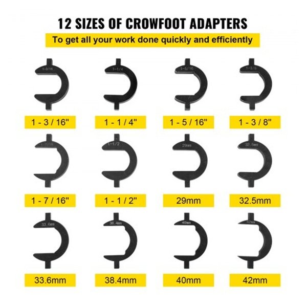 Το σετ περιλαμβάνει 12 crowfoot (rooster foot) αντάπτορες διαφορετικών μεγεθών, επιτρέποντας την προσαρμογή σε μεγάλη ποικιλία οχημάτων, όπως αυτοκίνητα, βαν και οχήματα εκτός δρόμου. Με αυτόν τον τρόπο μπορείτε να πραγματοποιείτε εργασίες επισκευής γρήγορα και αποτελεσματικά, χωρίς να χρειάζεστε πολλαπλά εργαλεία.