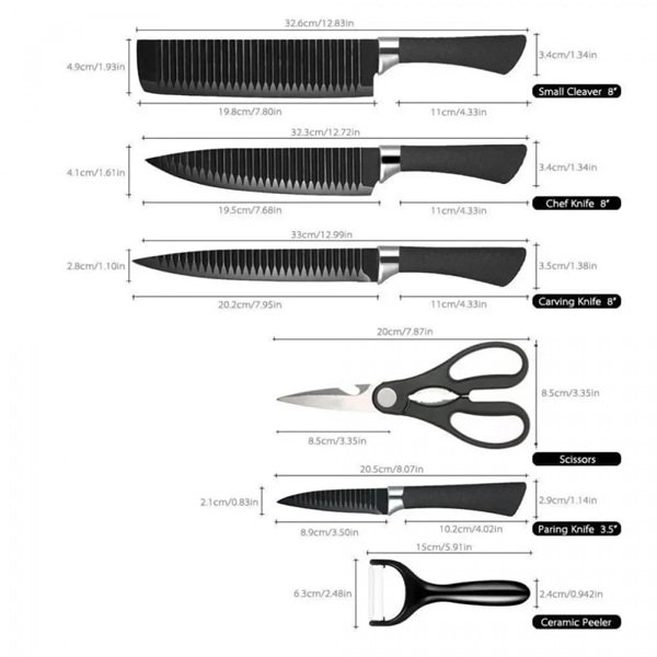 Το σετ περιλαμβάνει 6 διαφορετικά μαχαίρια, ώστε να καλύπτει όλες τις βασικές ανάγκες κοπής στην κουζίνα. Με μοντέρνο σχεδιασμό και πρακτική χρήση, αποτελεί ιδανική επιλογή για το σπίτι αλλά και μια εξαιρετική ιδέα δώρου.