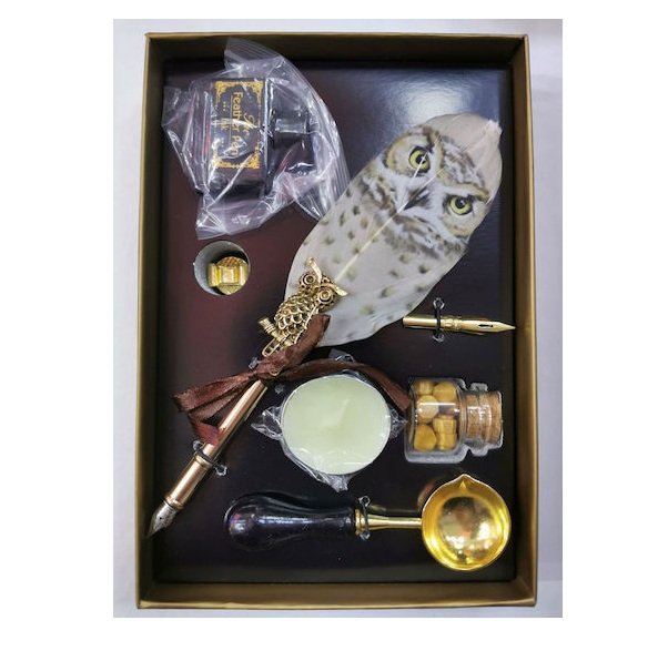 Σετ πένα με φτερό για καλλιγραφία. Είναι ειδική πένα που δεν κρατάει το μελάνι μέσα σε αμπούλα, όπως οι κλασικές πένες γραφής. Χειροποίητη και σκαλιστή, διακοσμημένη με φτερό, προσφέρει μια vintage αίσθηση. Με τις πένες καλλιγραφίας, θα πρέπει να βουτάτε συνεχώς τη μύτη τους μέσα στο μελάνι που περιέχεται στη συσκευασία. Πριν γράψετε στο χαρτί, βεβαιωθείτε ότι η μύτη είναι σε γωνία 45ᵒ για τη καλύτερη ροή του μελανιού. Κάντε μερικές δοκιμές για να δείτε πώς λειτουργεί το μελάνι με τη μύτη και το χαρτί που διαθέτετε.