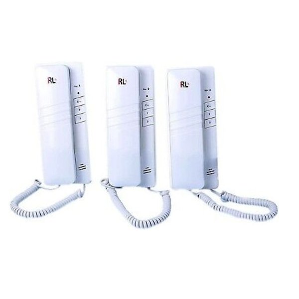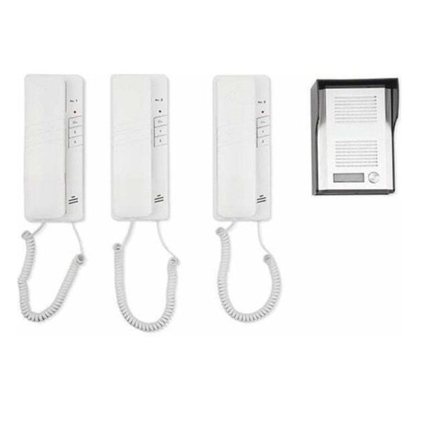 Σετ θυροτηλεφώνου Tele για μονοκατοικία με 3 εσωτερικές συσκευές και μονή μπουτονιέρα ενός πλήκτρου, ιδανικό για κατοικίες με πολλαπλά επίπεδα ή χώρους που απαιτούν έλεγχο εισόδου από διαφορετικά σημεία.