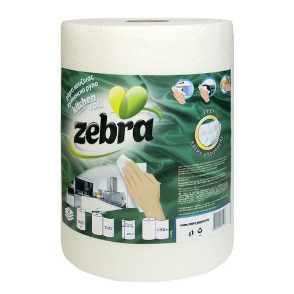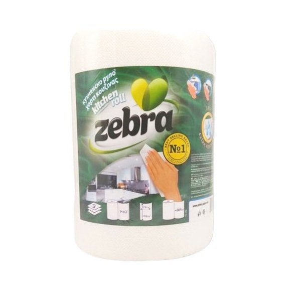 Χαρτί κουζίνας Zebra 3 φύλλων με υψηλή απορροφητικότητα και αντοχή. Συσκευασία 8 ρολών (500g/ρολό), ιδανικό για καθημερινή χρήση στο σπίτι ή τον επαγγελματικό χώρο.